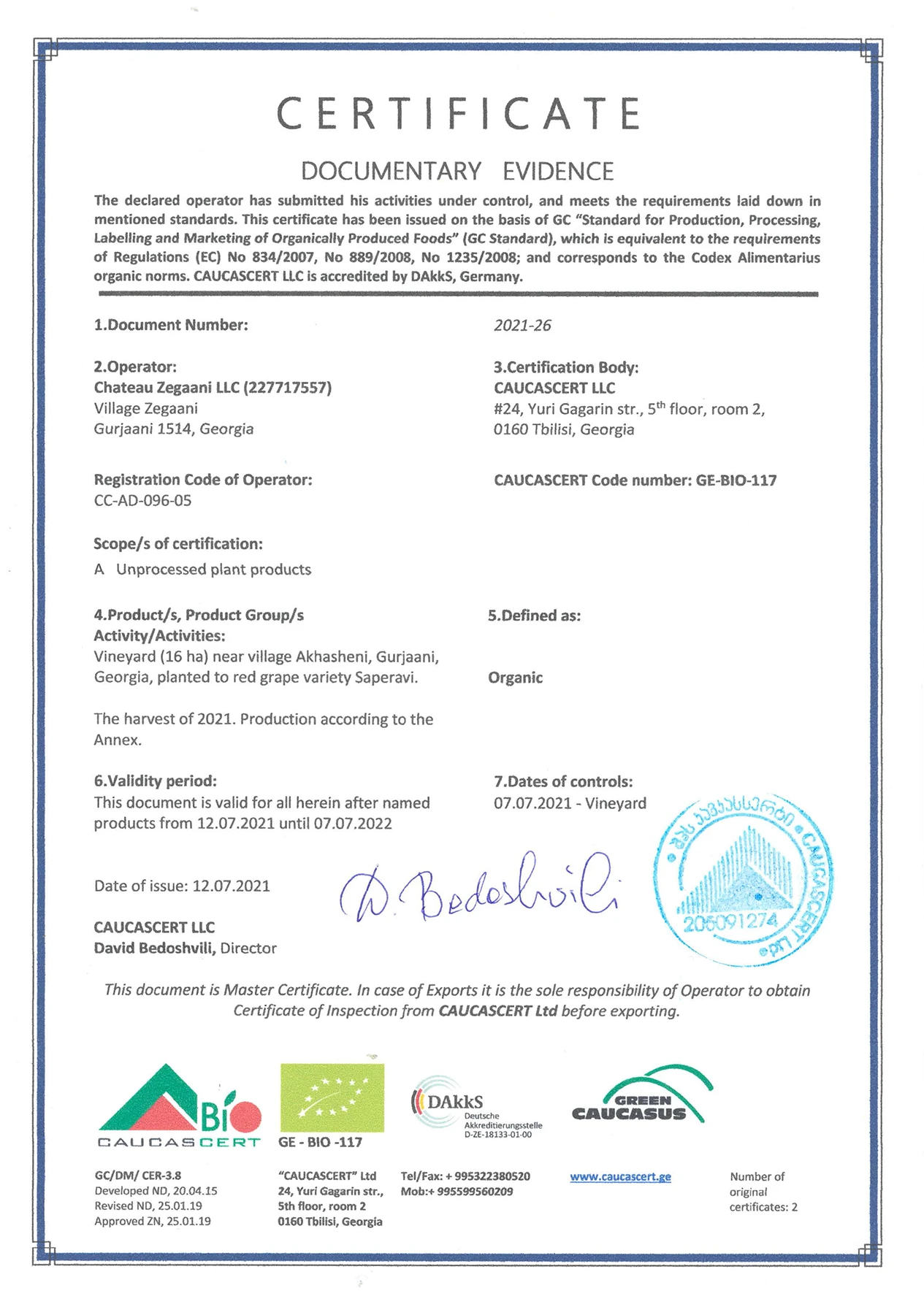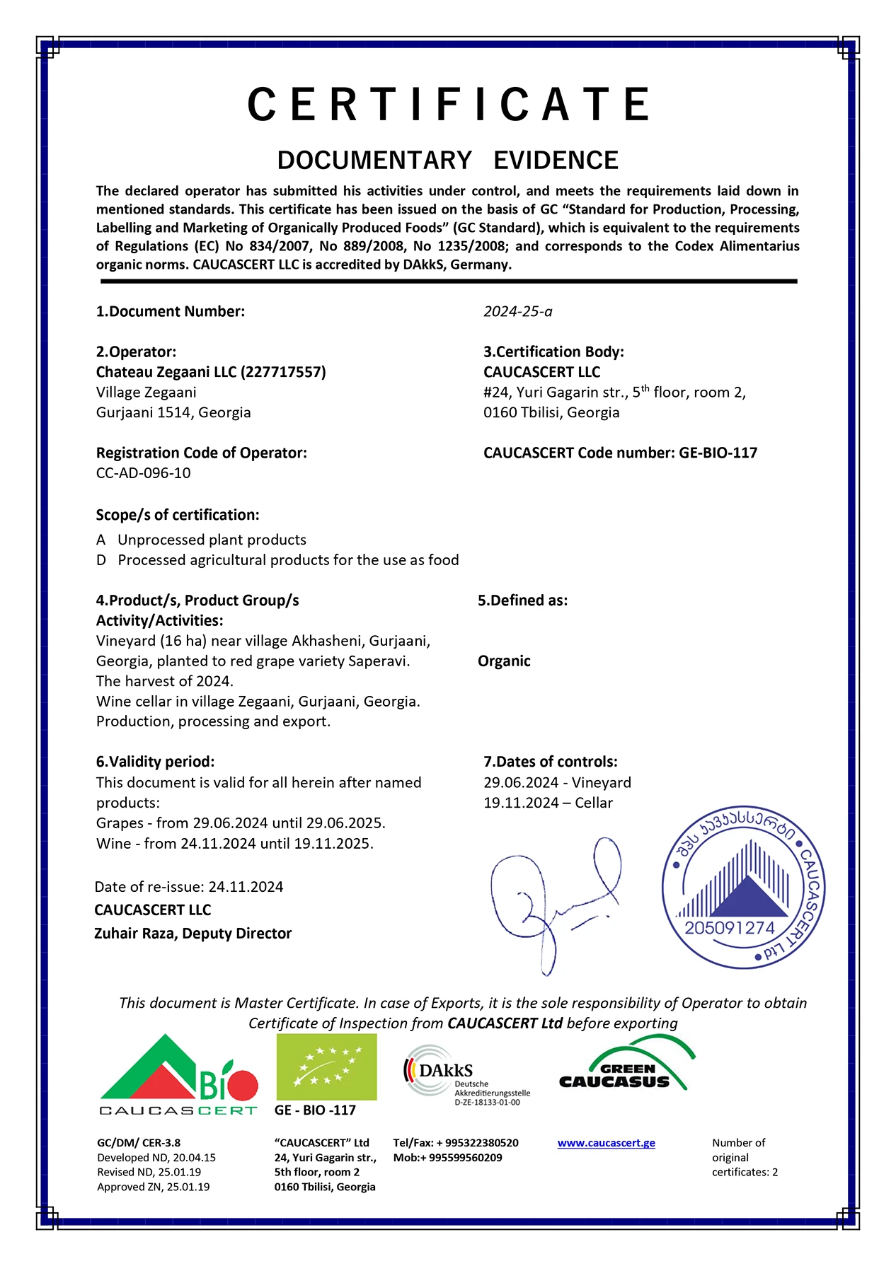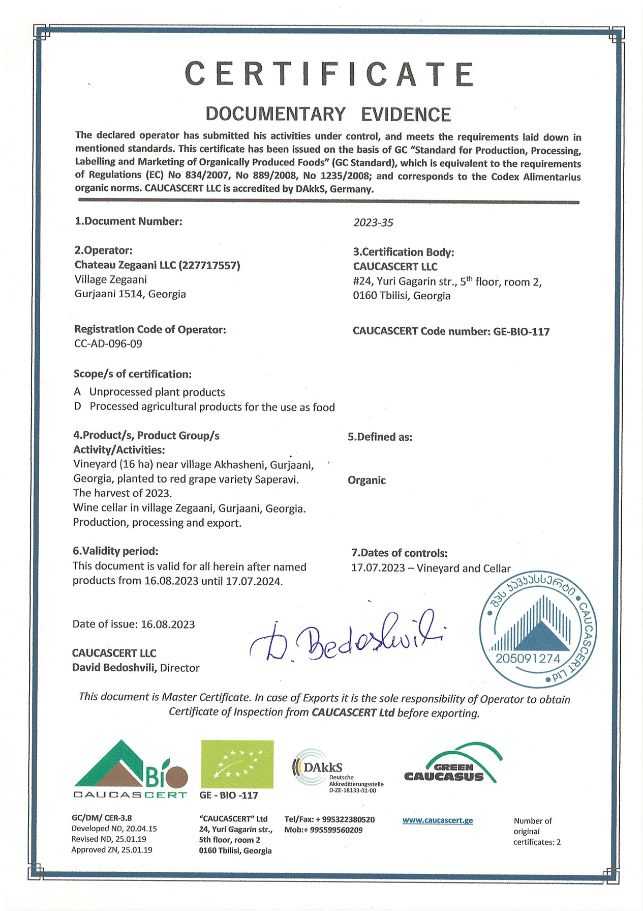 Fermented and aged in qvevri. After fermentation, the wine was separated from the pomace and sediment, then aged in qvevri for 24 months at a temperature of 9–11°C.